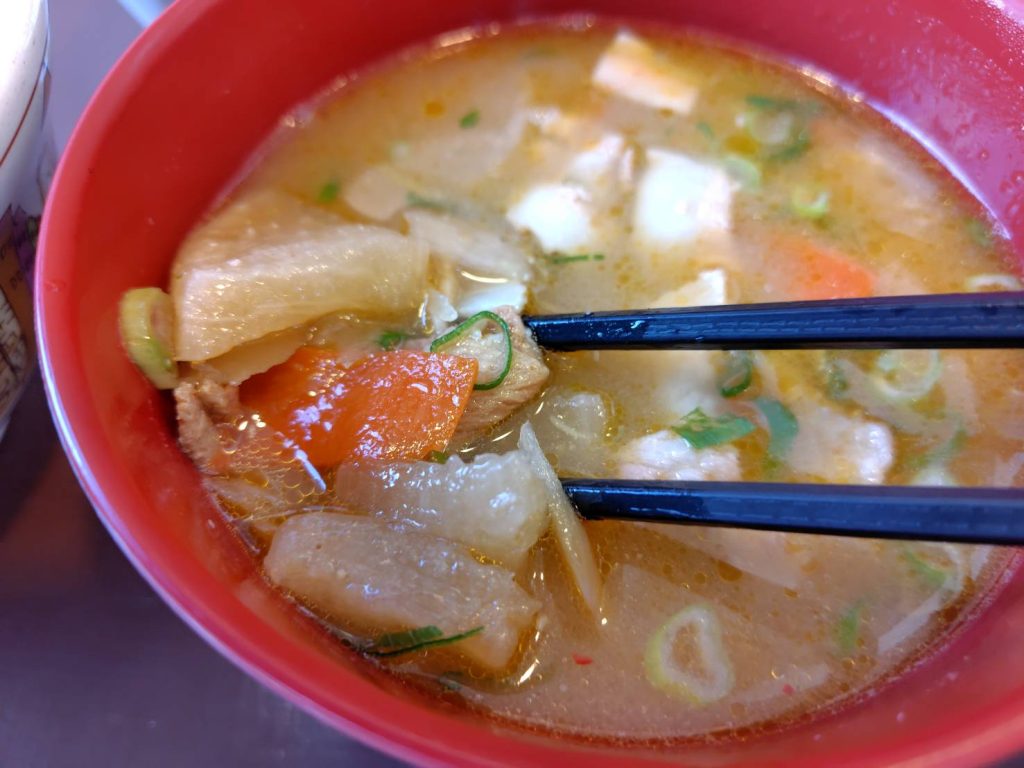 The Pork Miso Soup is loaded with ingredients like pork, daikon radish, carrots, and burdock root. This hearty, savory soup pairs perfectly with gyudon and adds a comforting touch to the meal.