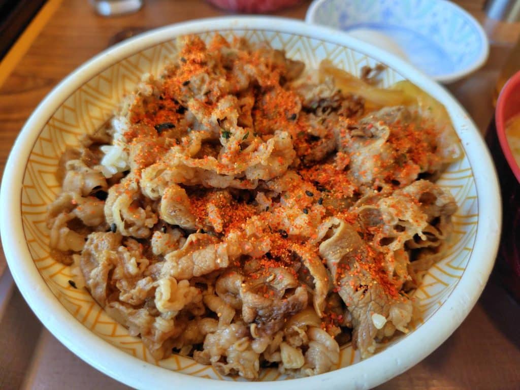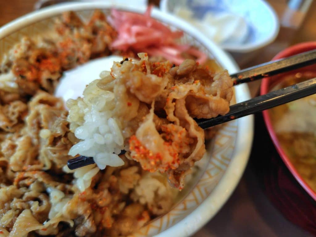 First, try the gyudon as is to appreciate its pure flavors. The sweet-savory soy-based sauce and juicy beef blend perfectly with the rice.